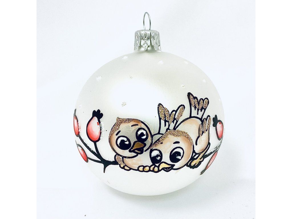 Sklenená vianočná ozdoba s textom na prianie - Biela nežnosť s vtáčikmi na šípku s vlastným textom (biela, 1 ks, 8 cm)