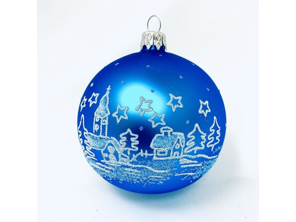 Sklenená vianočná ozdoba s textom na prianie - Noc s dedinkou - možnosť vlastného textu (modrá, 1 ks, 8 cm)