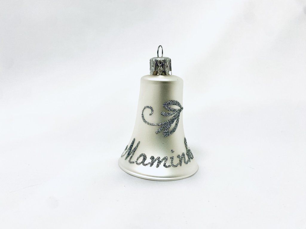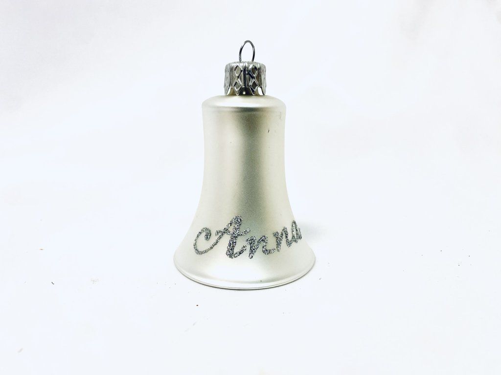 Vianočný sklenený zvonček s menom – Čarovná vianočná ozdoba pre nezabudnuteľné chvíle (biela, 1 ks, 7 cm)
