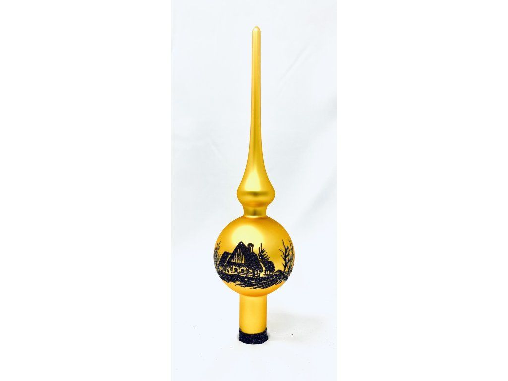 Zlatá vianočná špica s ručne maľovaným motívom (zapadané krajiny).