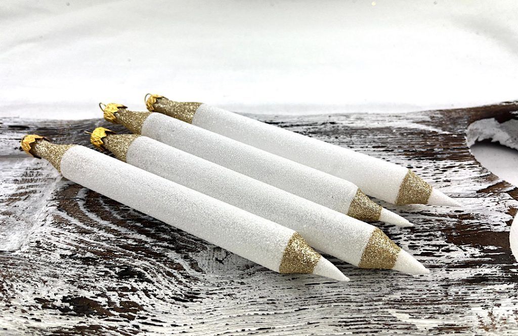 Sklenené ceruzky celosypané. Spodok a vrch ceruzky má zlatý dekor . Ostatné je sypané bielym jemným posypom.