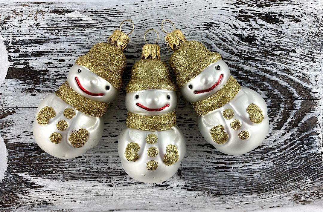 Sklenené figúrky v podobe snehuliačikov so sypanou, zlatou čiapkou, šálom a rukavičkami.