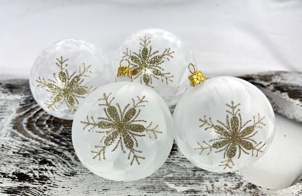 Vianočné gule 20/8510-5/8/4ks – biely mrazolak + zlatá vločka