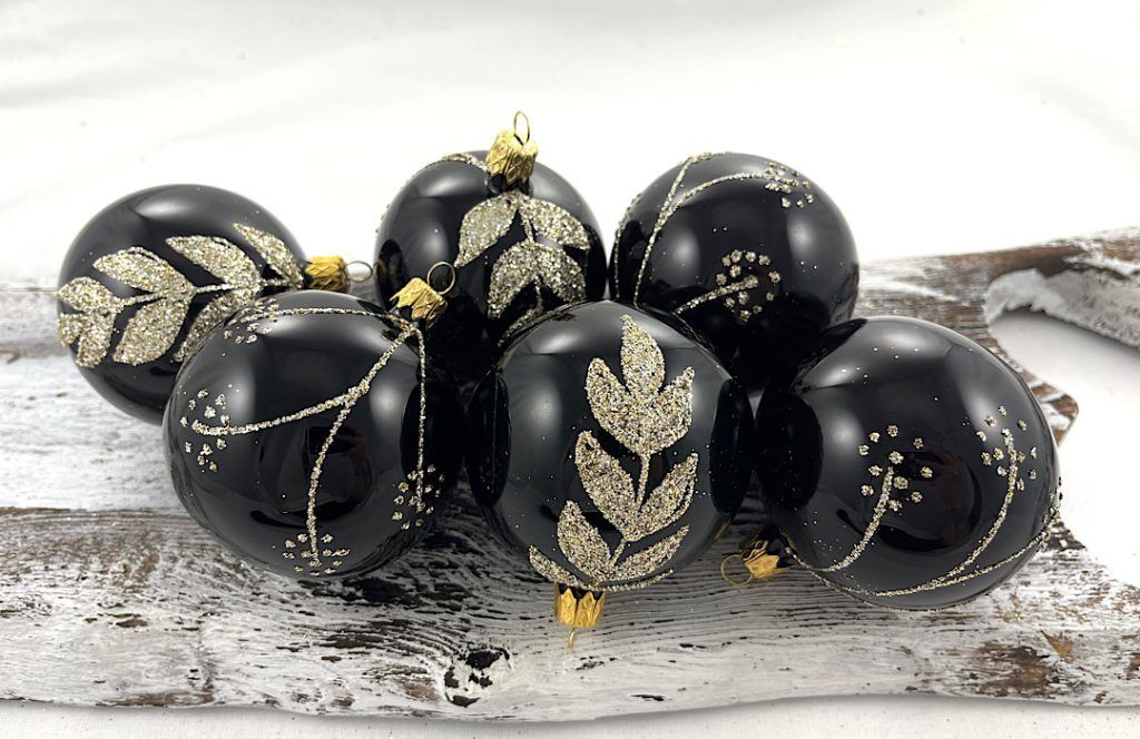 Sklenené vianočné gule , nestriebrené (pri pohľade do svetla cez ozdobu vidíte) v čiernej elegantnej farbe s dekorom tzv. platina (mix strieborného a zlatého posypu) . Z jednej strany sa nachádzajú bohaté listy a z druhej jemné vetvičky.
