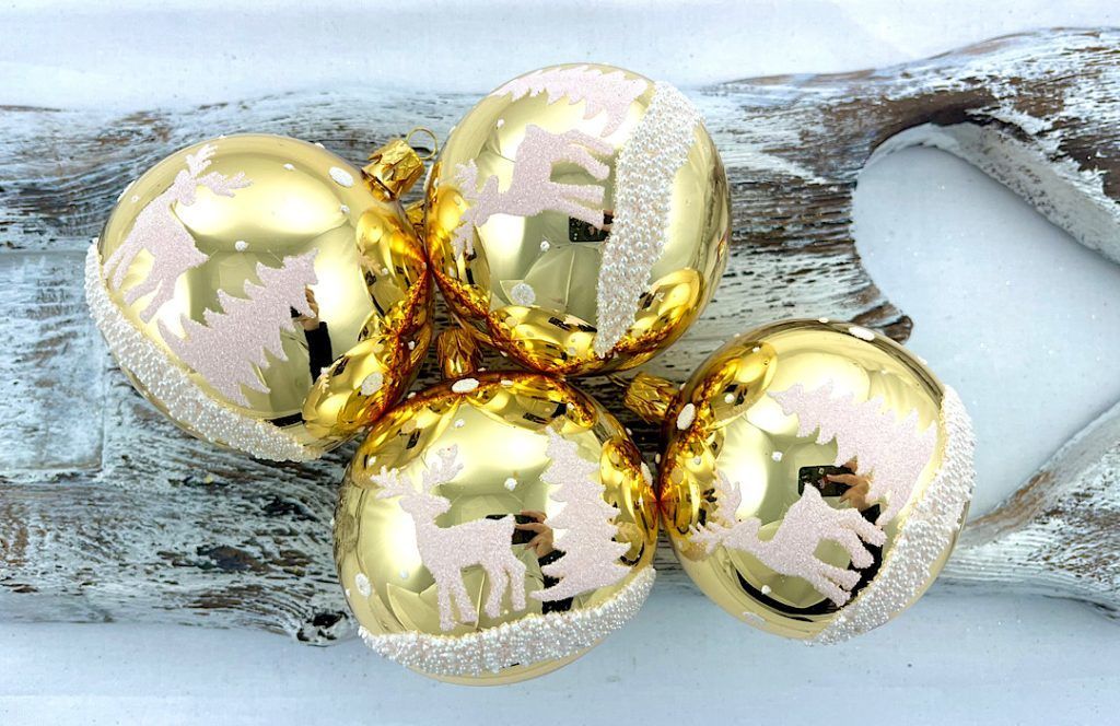 Sklenené vianočné guličky v žiarivej zlatej farbe s bielym jeleňom a stromčekom. Po celej guličke sú veľké a malé bodky . Pod bielym dekorom sa nachádza zasypaná cesta , kde je použitý biely posyp a biele guličky.