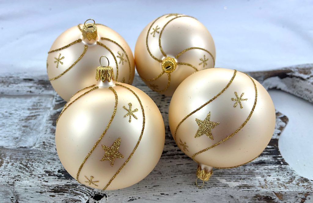 Sklenené guličky v jemnej champagne farbe so zlatým dekorom vločiek a hviezdičiek .