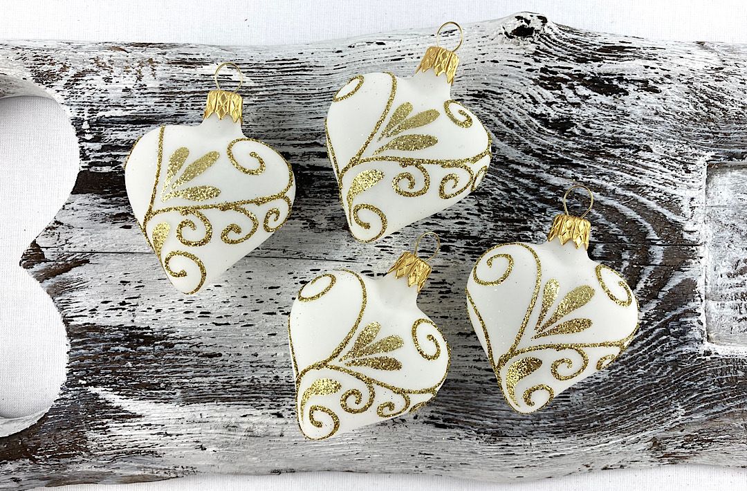 Sklenené srdiečka so zlatými špirálkami.