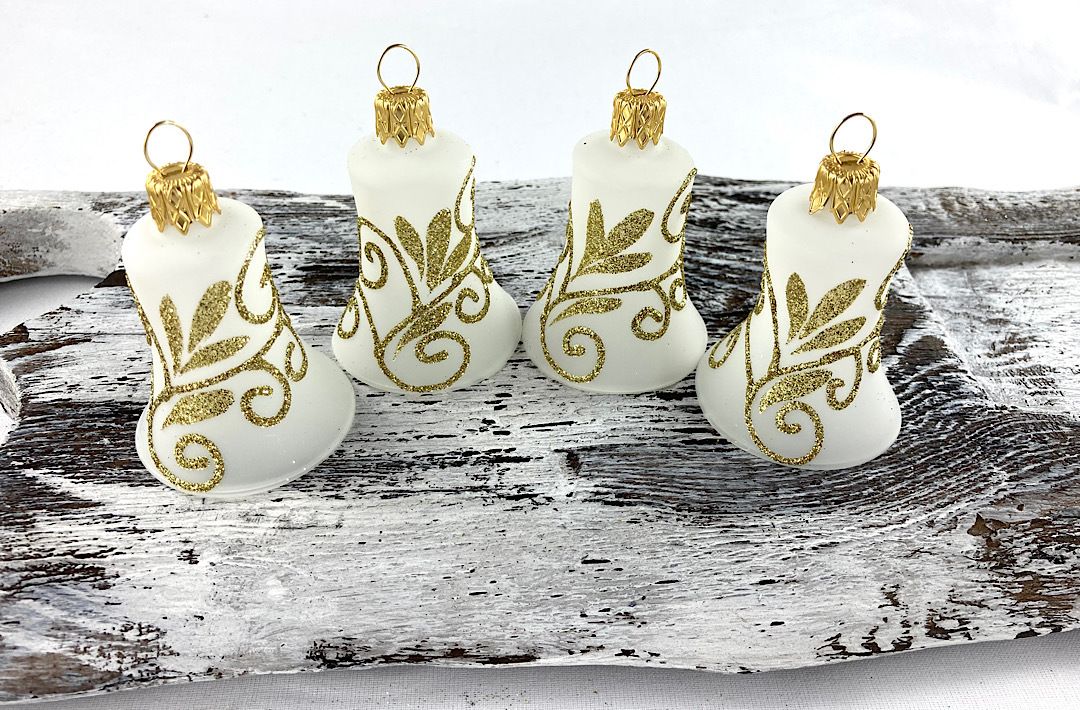 Sklenené zvončeky so zlatými špirálkami.
