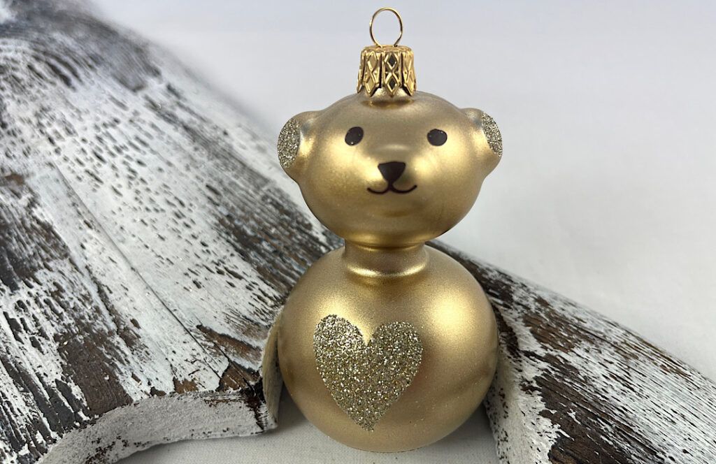 Sklenený macko máčaný do zlatej metalízy so zlatým posypom.
