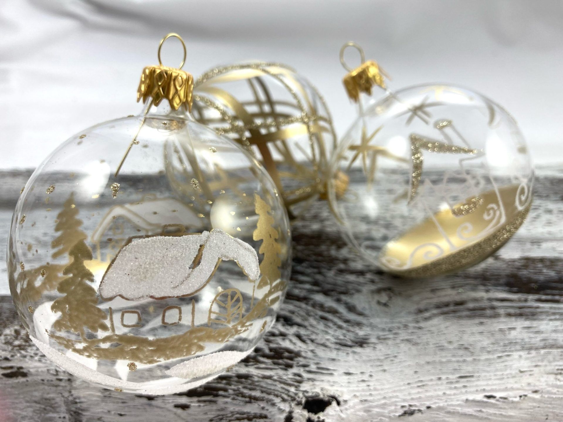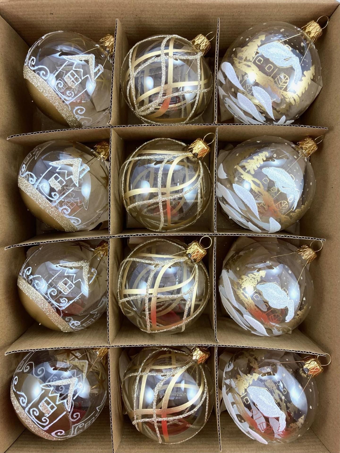 Sklenený set čírych gúľ s bielo-zlatým dekorom.