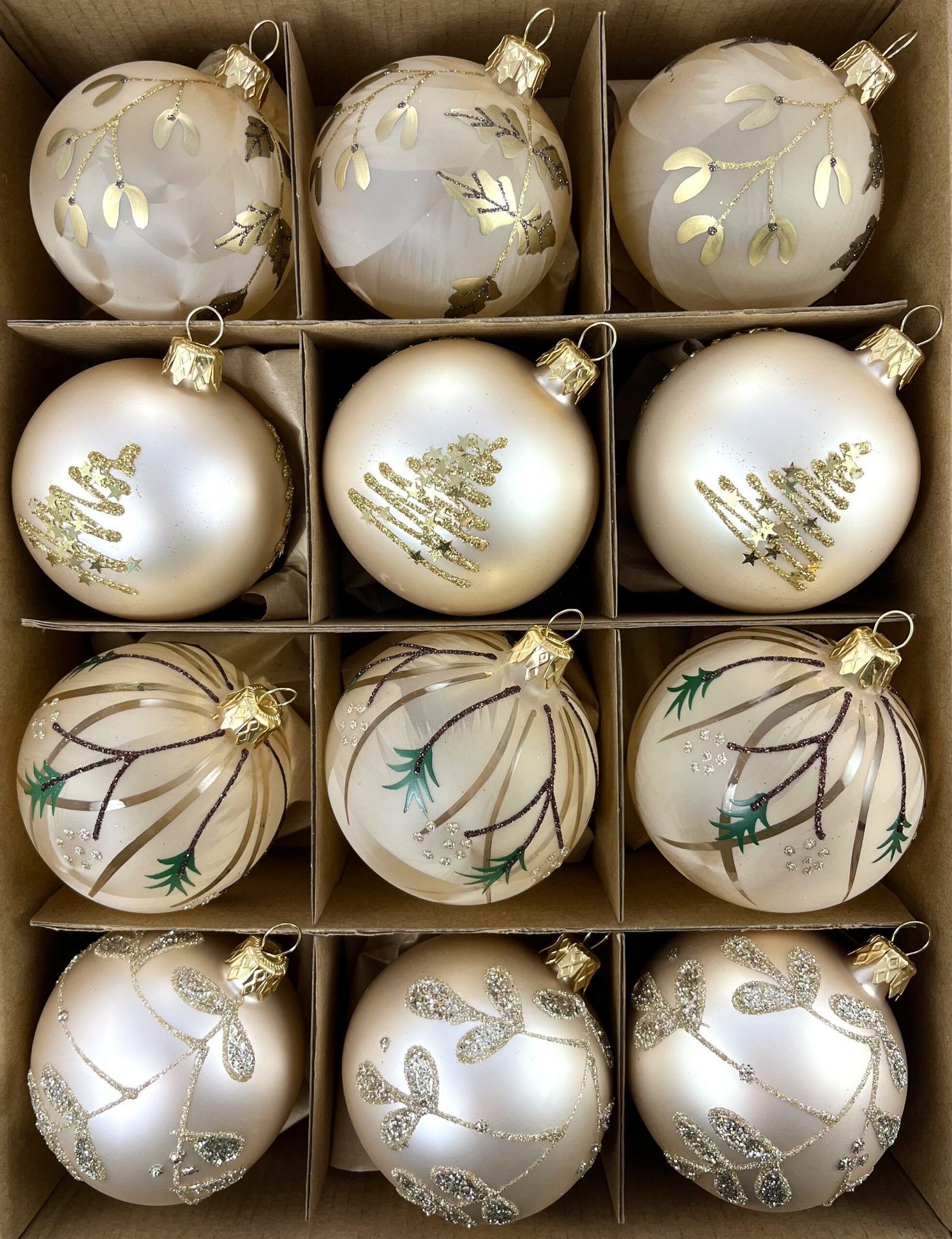 Sklenený vianočný set , ktorý obsahuje 4 druhy po 3 kusy . Ide o kombináciu farby champagne v matnom prevedení a v nestriebrenom mrazolaku (farba , ktorá vytvára mrazivý efekt).