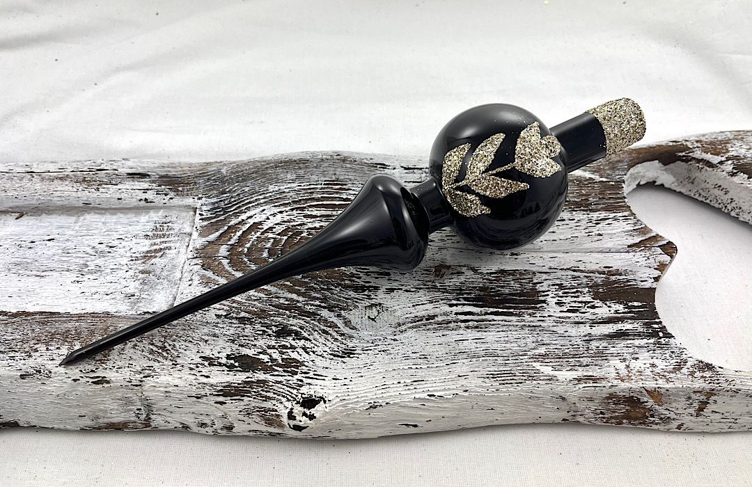 Sklenené vianočný špic nestriebrený , (pri pohľade do svetla cez ozdobu vidíte) v čiernej elegantnej farbe s dekorom tzv. platina (mix strieborného a zlatého posypu) . Z jednej strany sa nachádzajú bohaté listy a z druhej jemné vetvičky.