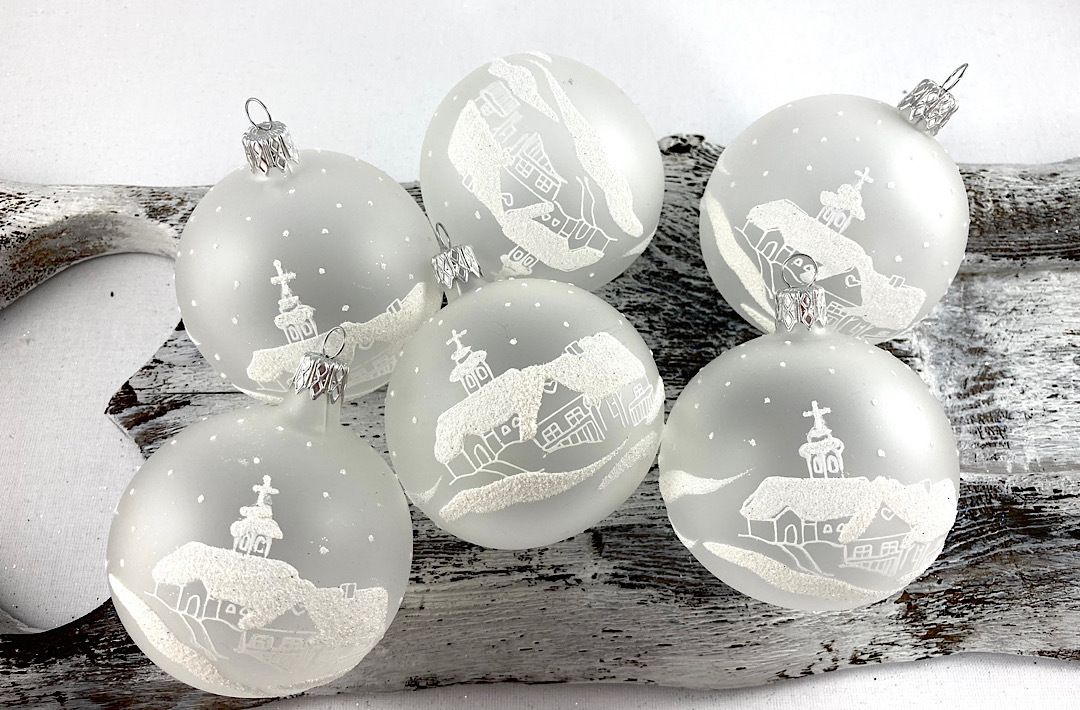 Sklenené guličky v snehovo-bielej farbe s motívom veľmi obľúbeným : kostol, domček