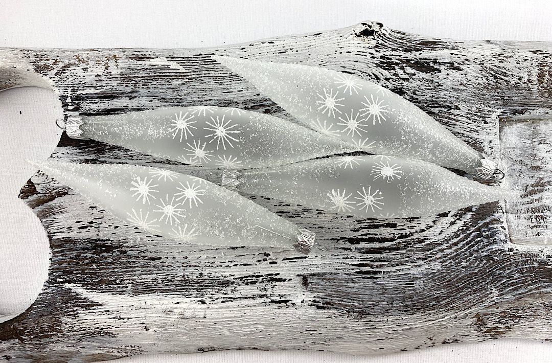 Sklenené, vianočné rakety s malými vločkami .