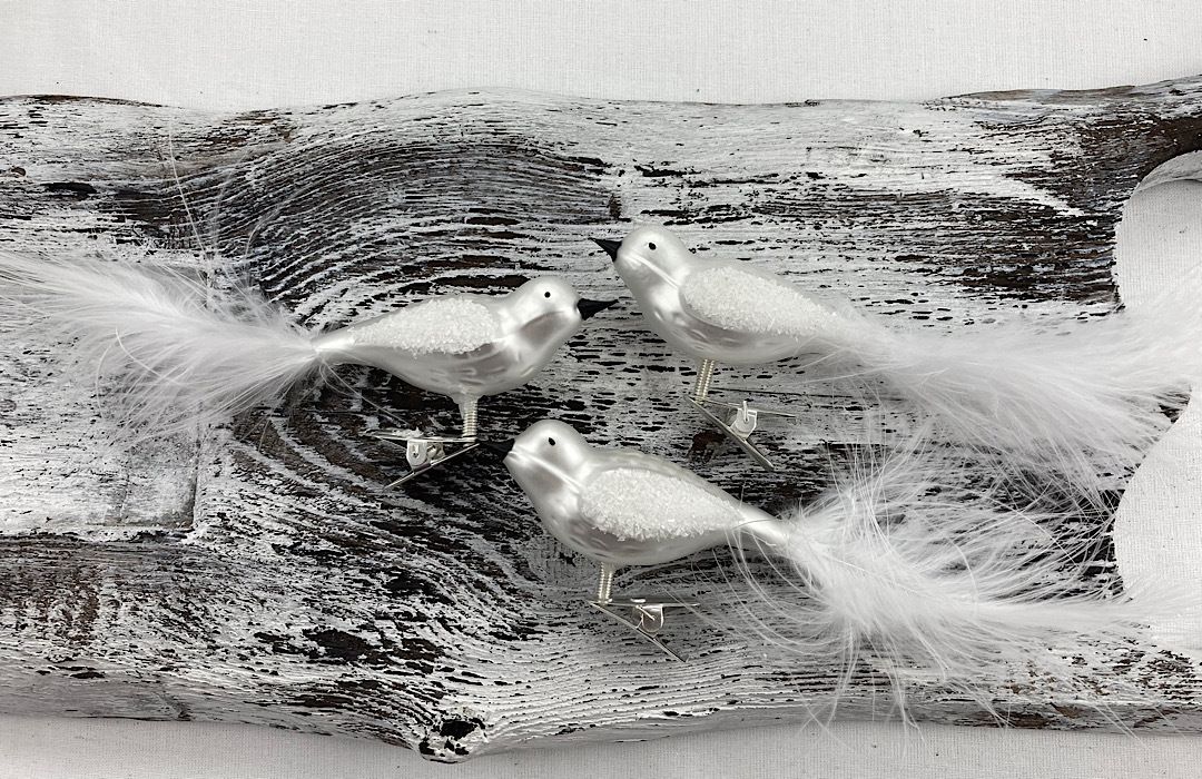 Sklenené vtáčiky v bielej farbe .
