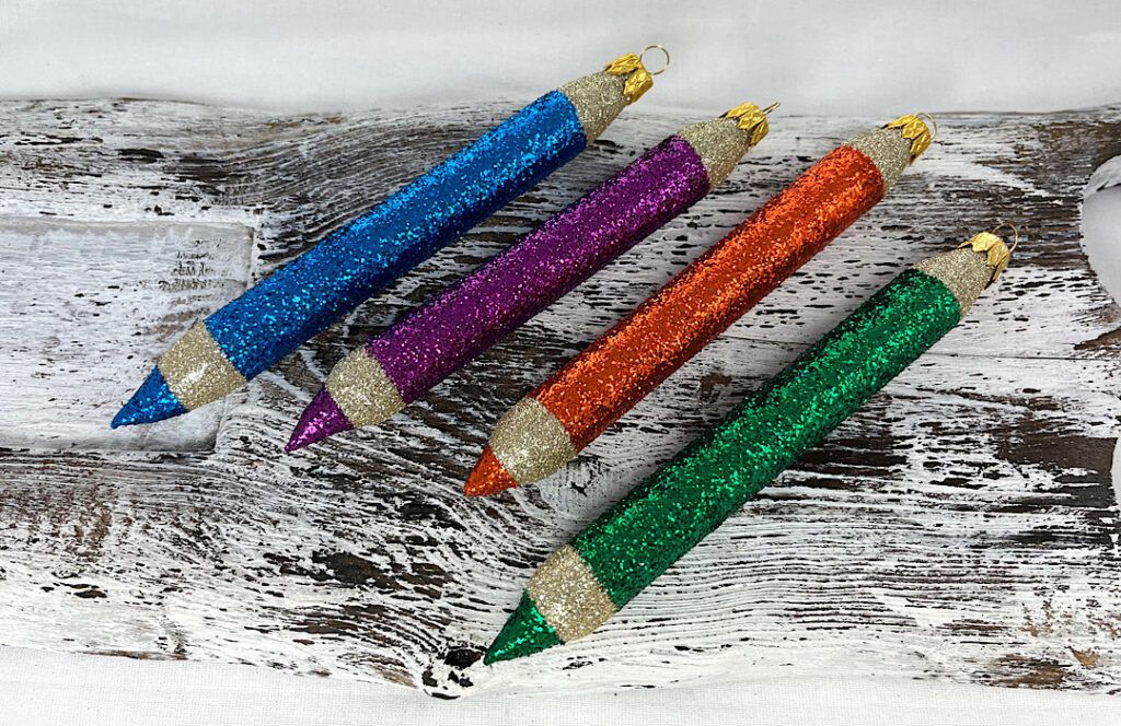 Sklenené ozdoby v podobe ceruziek . Sypané hrubým trblietavým posypom .