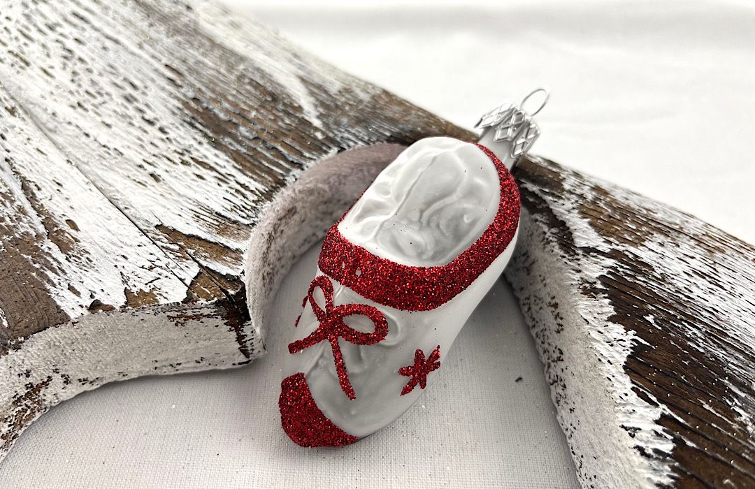 Sklenená ozdoba v podobe bielej črievičky s červeným zdobením .