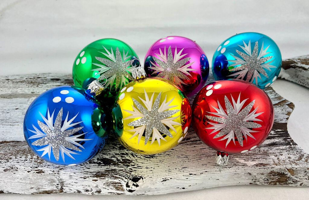 Sklenené vianočné guličky v retro farbách so striebornou hviezdou . V ponuke celá kolekcia .