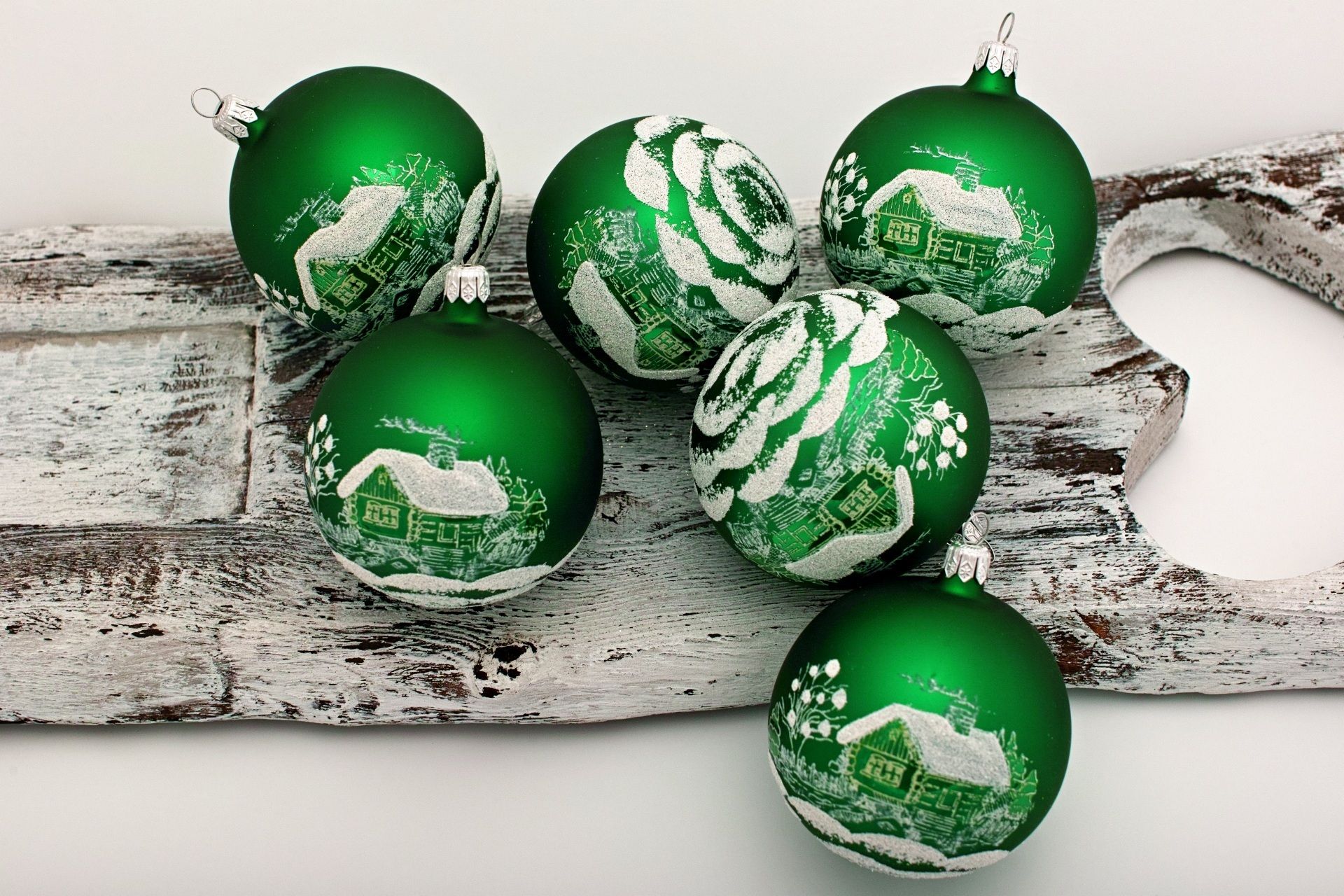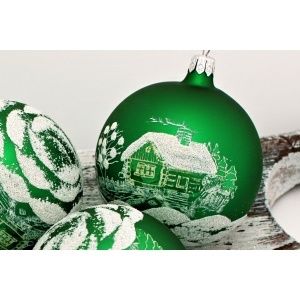 Sklenené zelené guličky s obľúbeným motívom chalúpky.