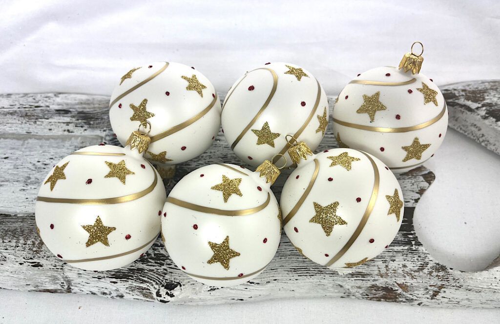 Sklenené vianočné guličky v bielej matnej farbe s hviezdičkami a červenými bodkami .