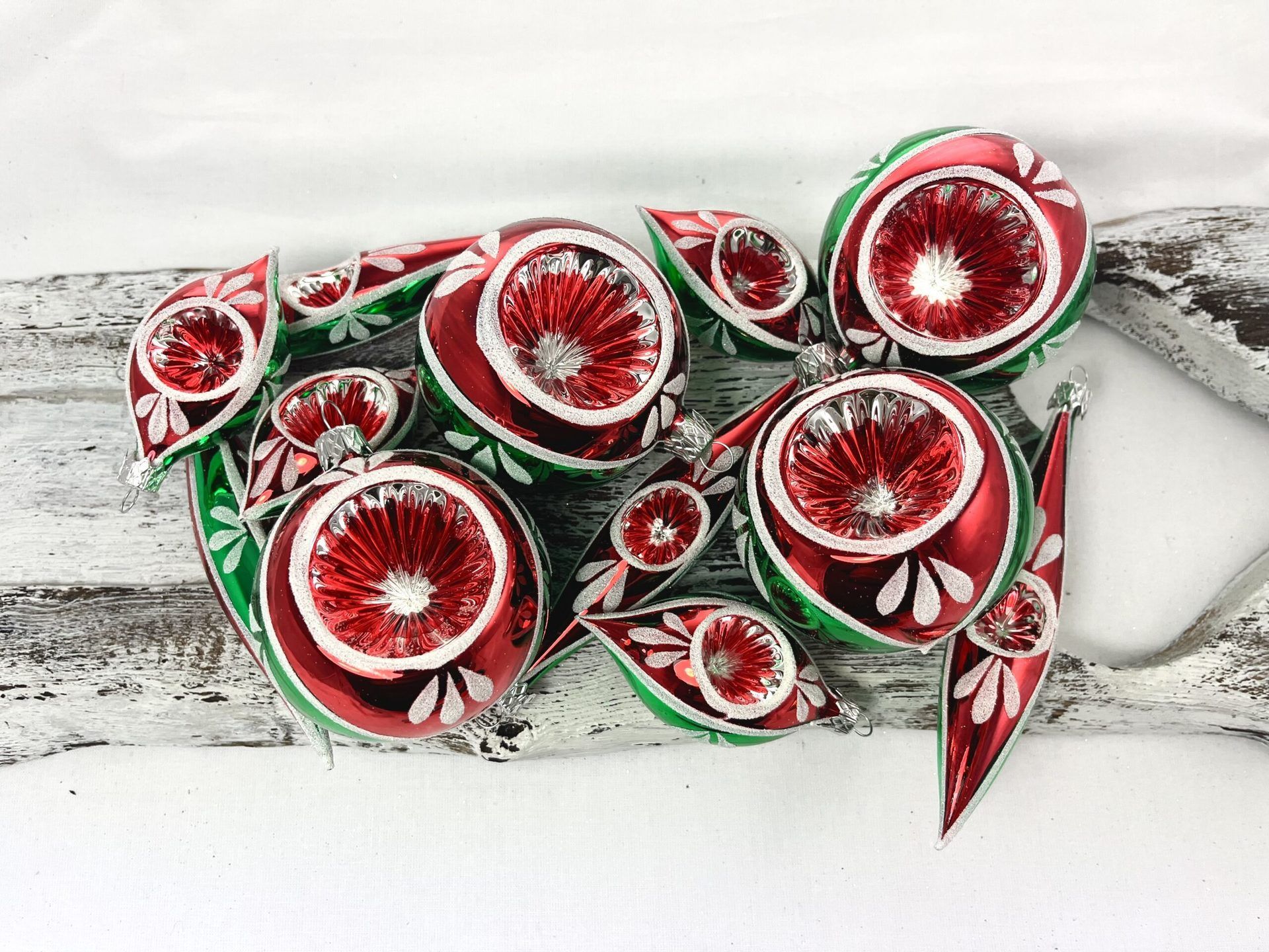 Sklenené vianočné ozdoby tzv. reflektory. Gulička má vpich smerom dnu . Pozor ! Veľmi krehké , hlavne okolie vpichu .
