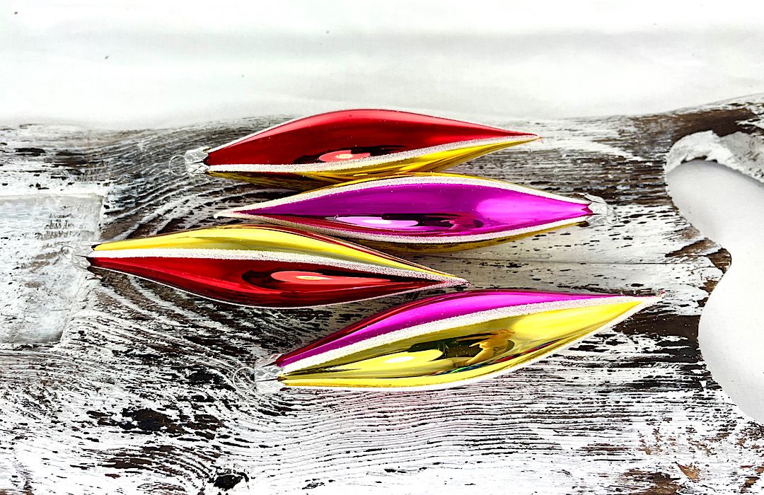 Sklenené raketky v retro štýle . Na každej raketke sa opakujú farby : žltá , červená , žltá , ružová .
