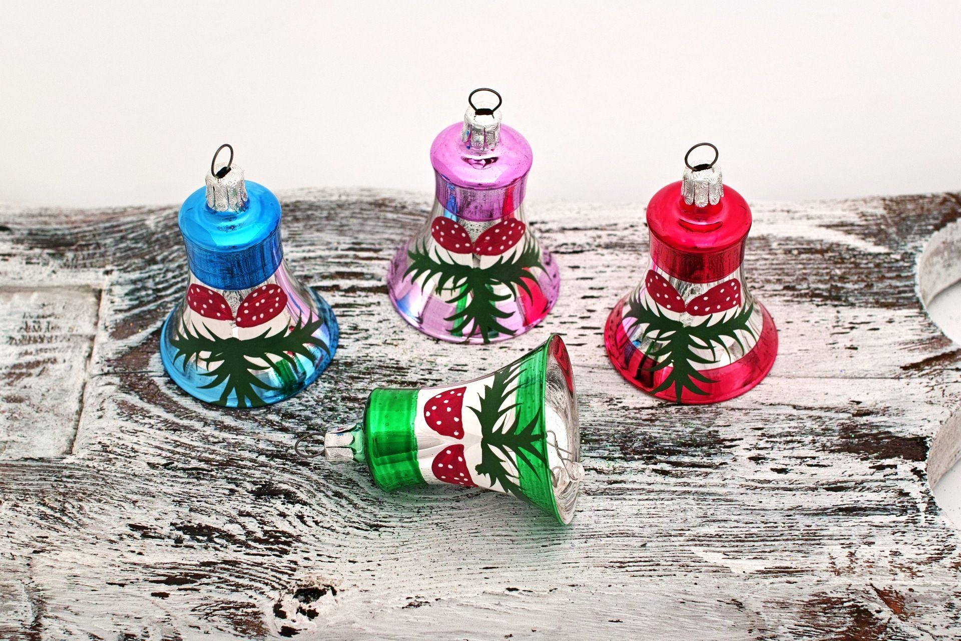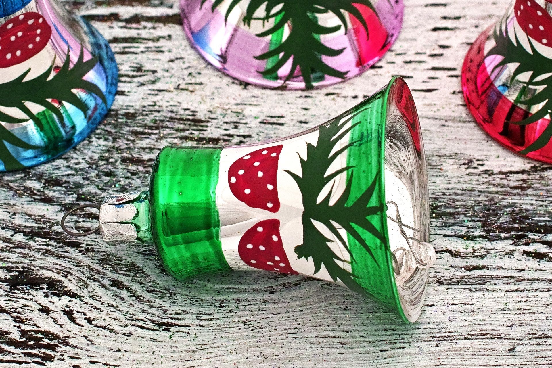 Sklenené zvončeky s dávkou nostalgie. Štyri farebné kombinácie s muchotrávkami.
