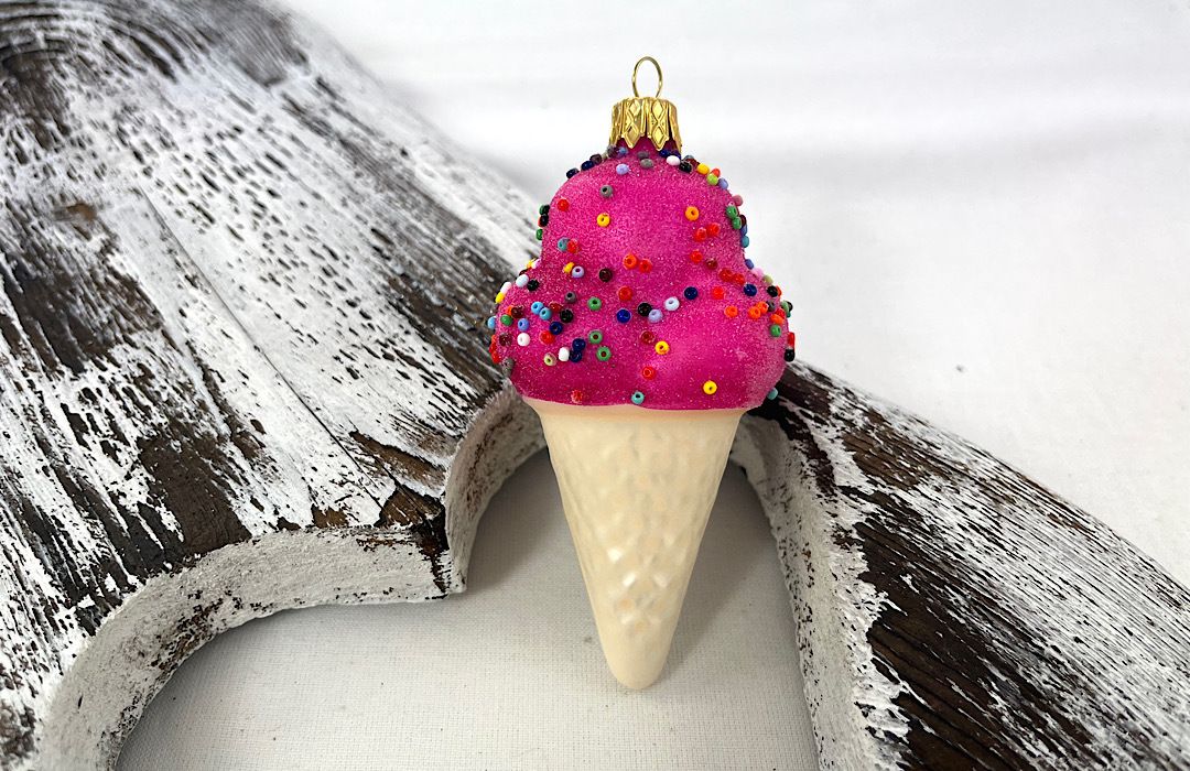 Ručne vyrobená sklenená ozdoba v tvare trojkopčekovej zmzliny. Kopčeky vo výraznej ružovej farby posypané veselými farebnými guľôčkami v kornútiku. Nezvyčajná , no hravá a neprehliadnuteľná ozdoba na vianočný stromček .
