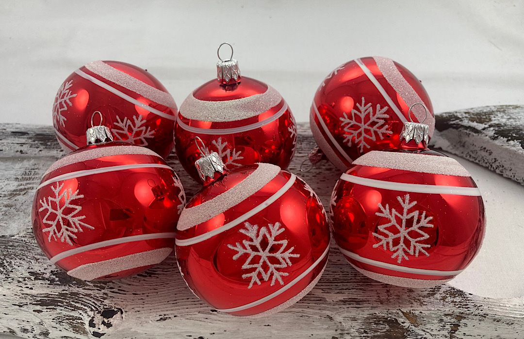 Sklenené guličky v červenej farbe s bielym dekorom vločiek.