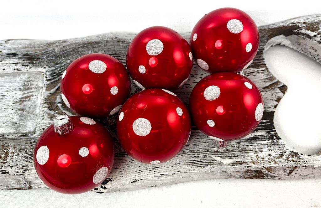 Sklenené vianočné guličky v červenej porcelánovej farbe s bielymi veľkými a malými bodkami.