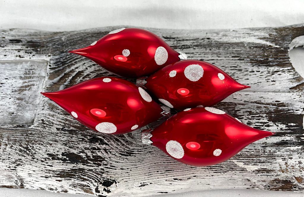 Sklenené vianočné olivy v červenej porcelánovej farbe s bielymi veľkými a malými bodkami.