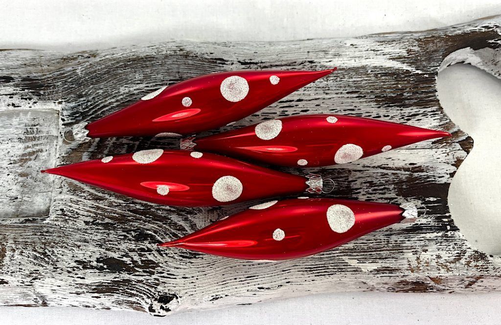 Sklenené vianočné raketky v červenej porcelánovej farbe s bielymi veľkými a malými bodkami.