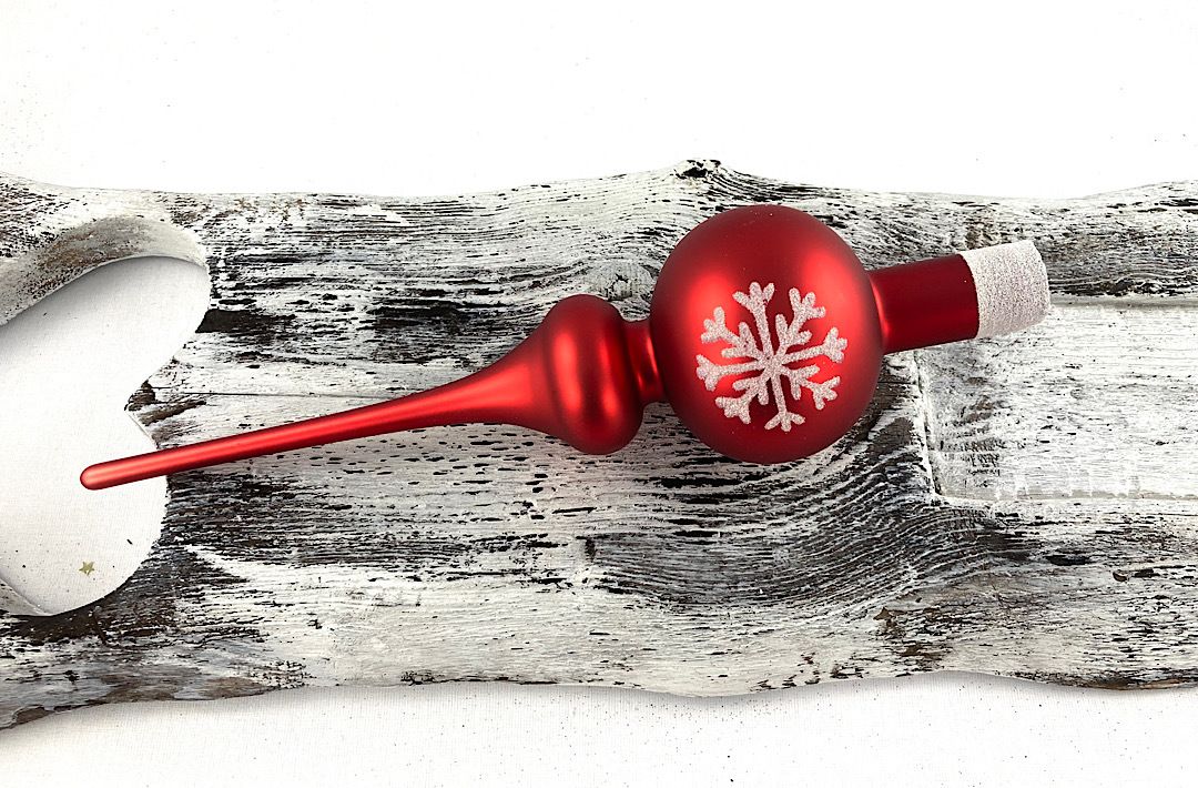 Sklenený špic v matnej červenej farbe s bielou vločkou.