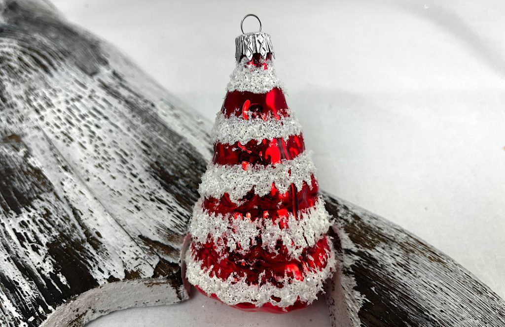 Sklenený stromček v červenej farbe s bielym zdobením.