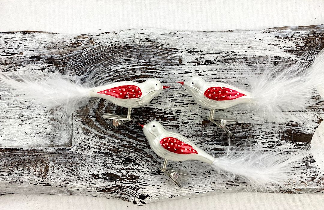 Sklenené vtáčiky v bielej farbe s červeným krídelkom.