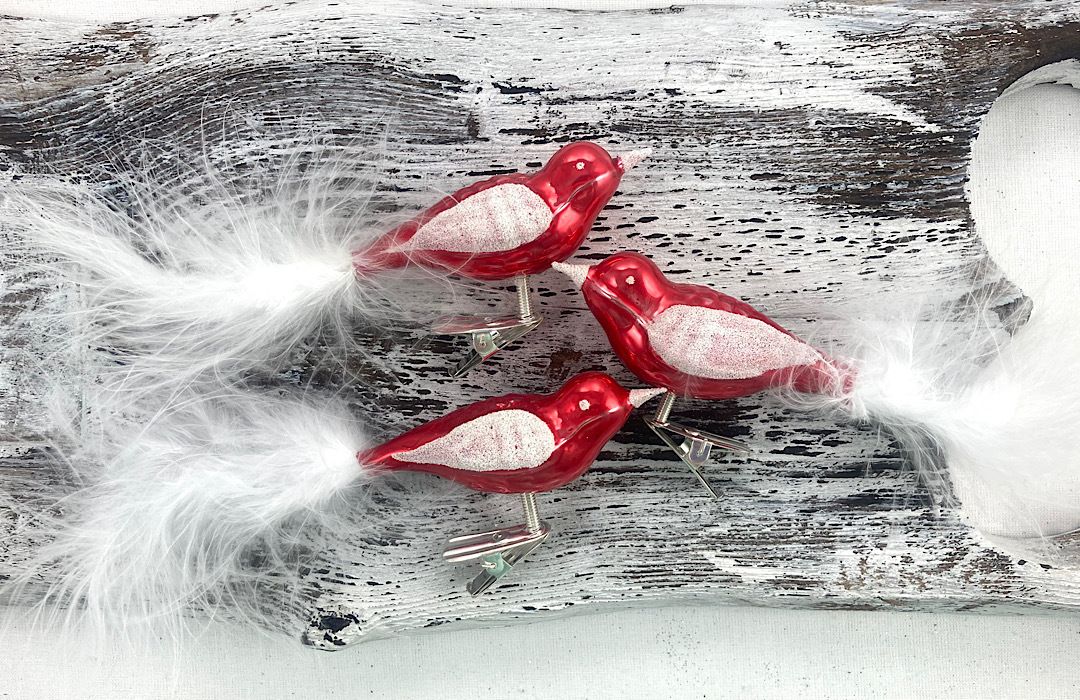Sklenené vtáčiky červenej farby s bielym krídlom.