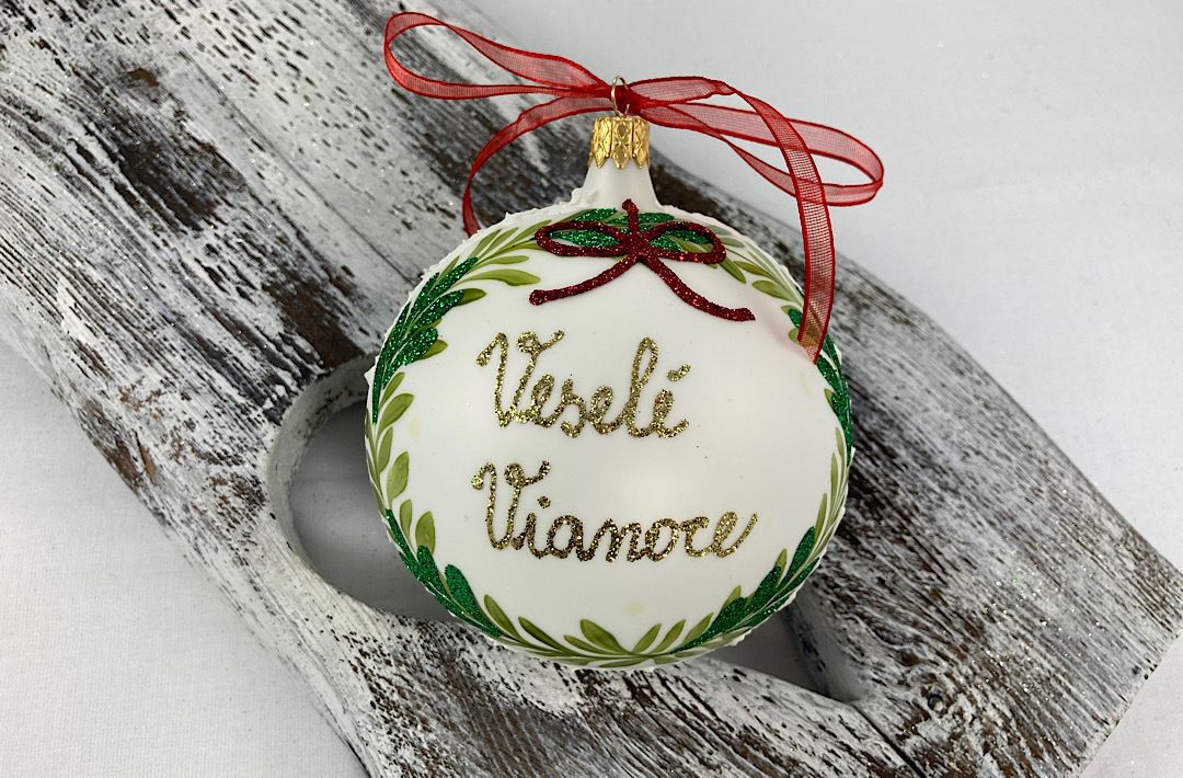 Sklenená gulička s priemerom 10cm a mašličkou na vešiaku. Vhodna ako darček. Na túto guľu NIE JE možné písať ani meniť nápis : Veselé Vianoce !