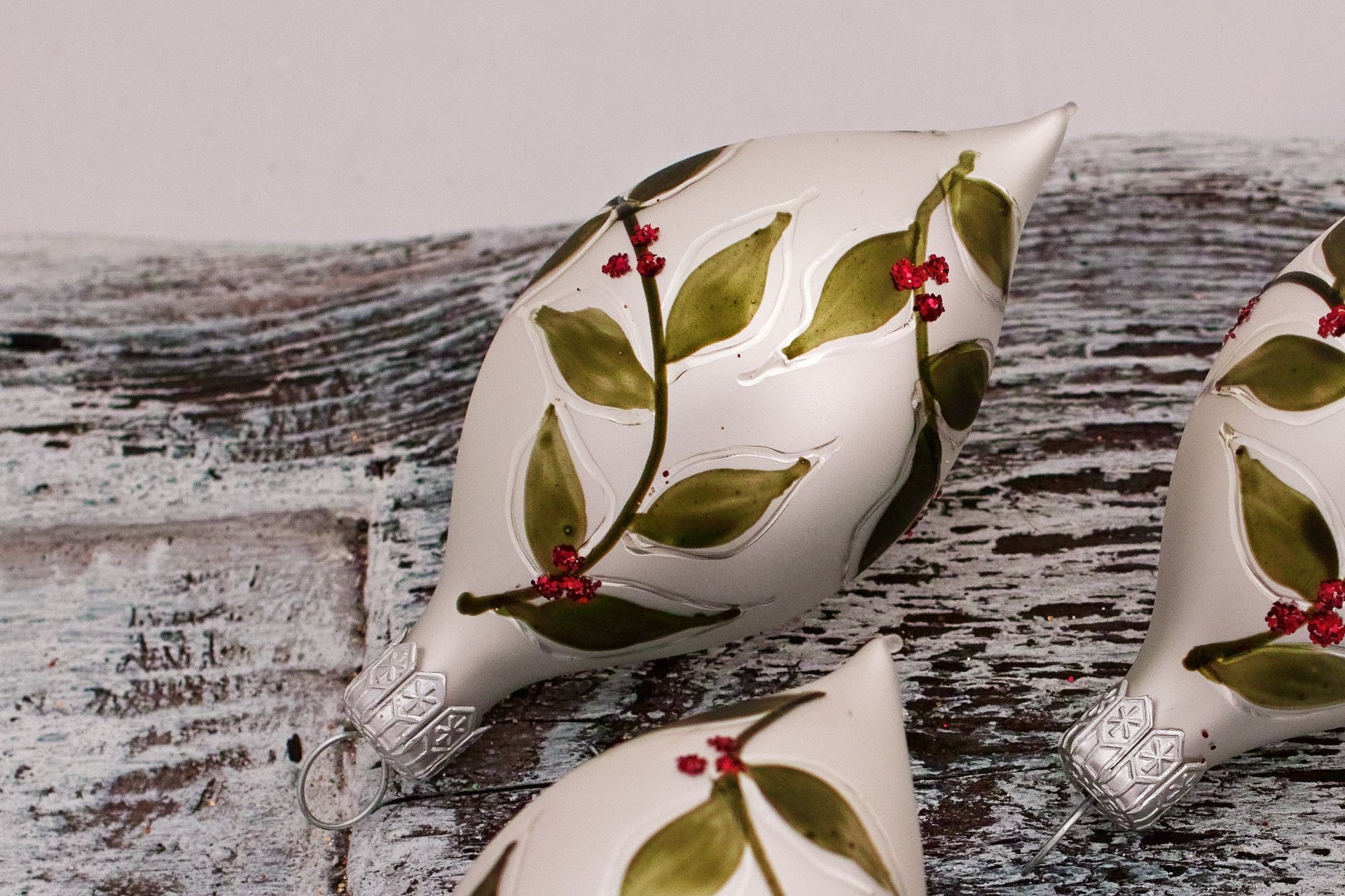 Sklenené olivky s precíznou ručnou maľbou v podobe listov cezmíny. Patrí medzi LUXUSNÉ KOLEKCIE.