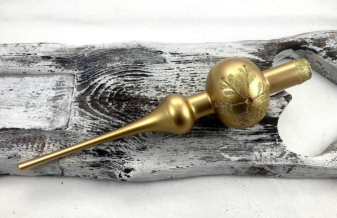 Sklenený špic vo farbe zlatá metalíza , ktorý zdobí kamienok v strede vločky.