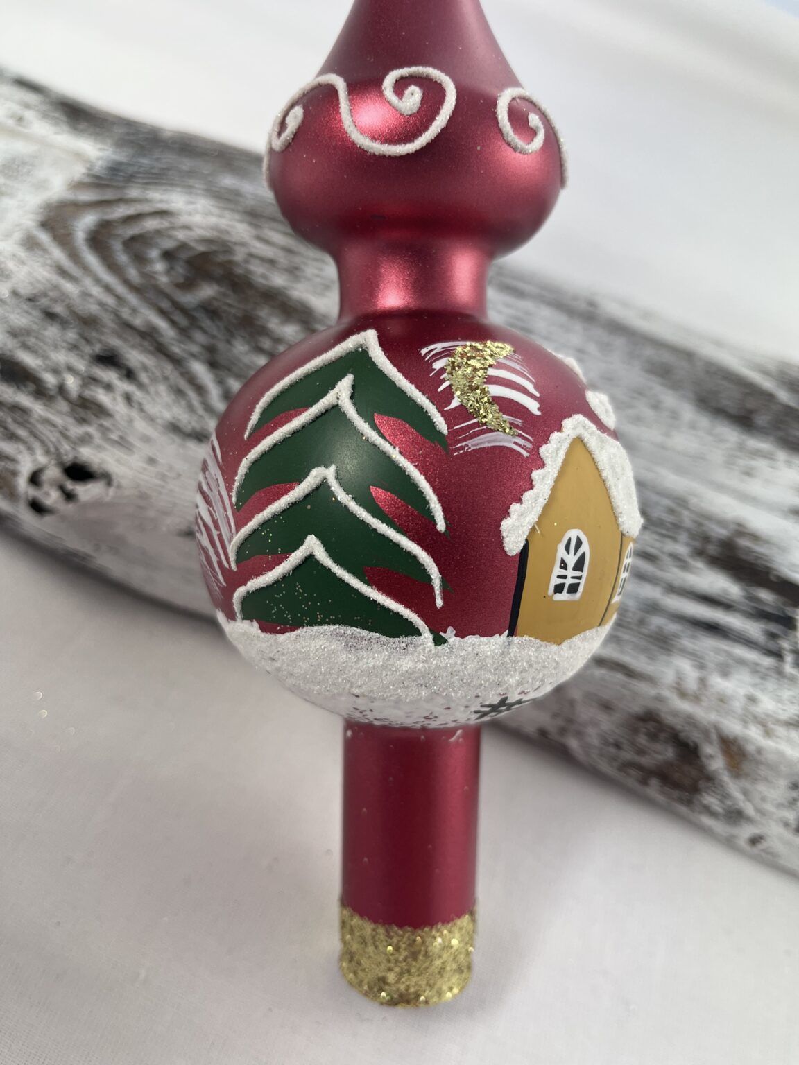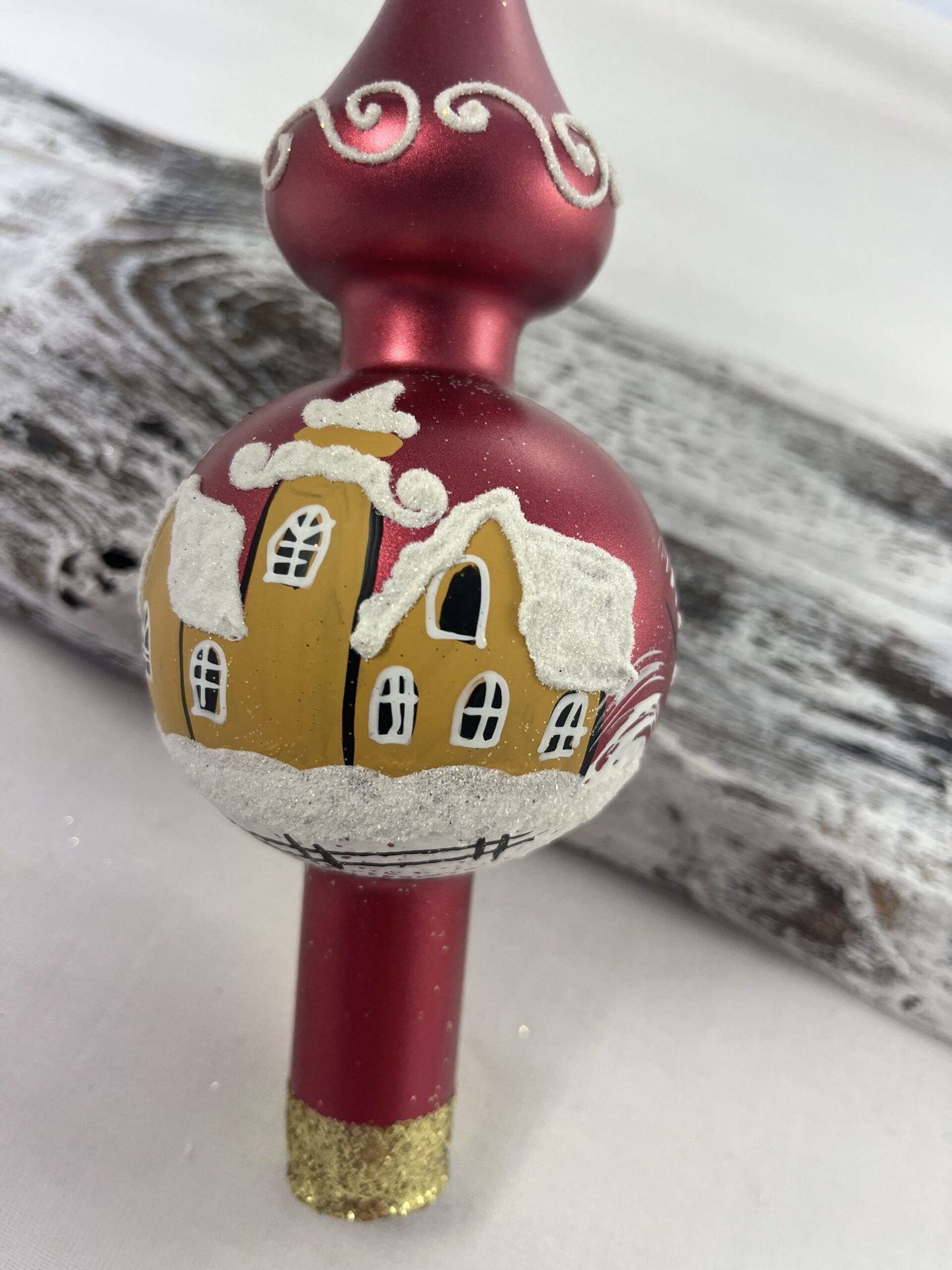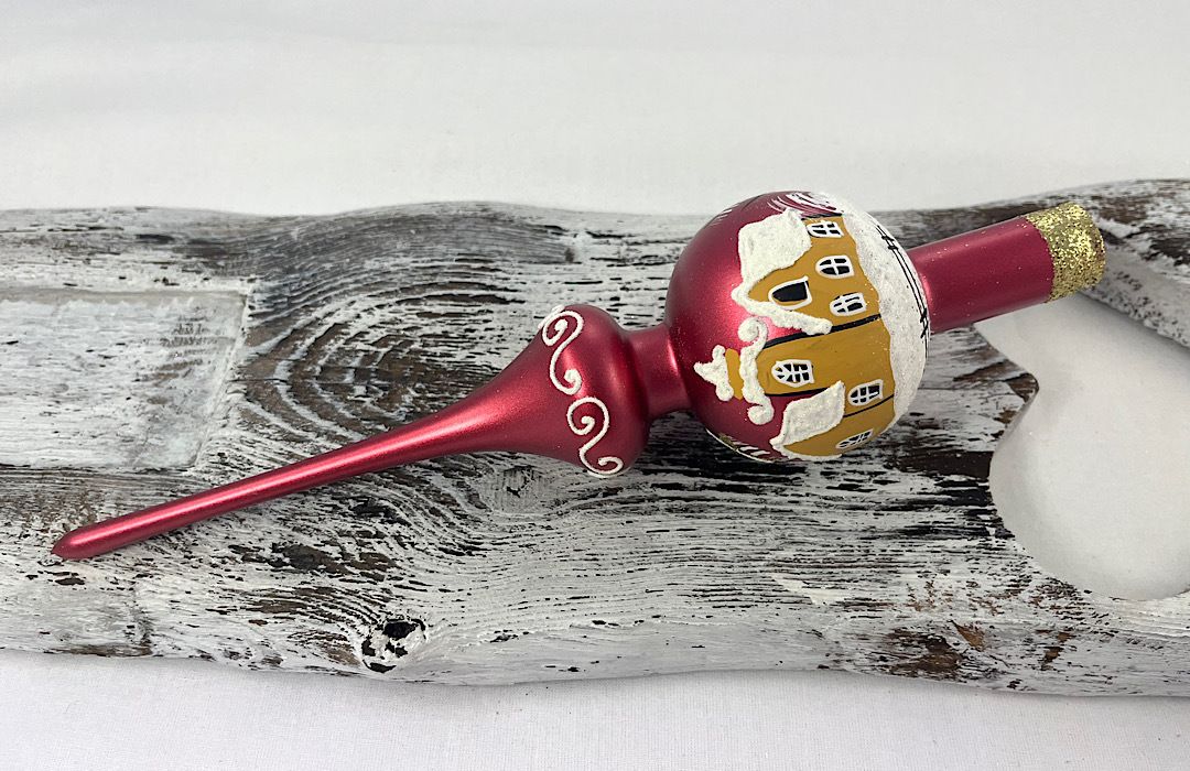 Sklenený vianočný špic s maľbou domčeka na červenej metalíze.