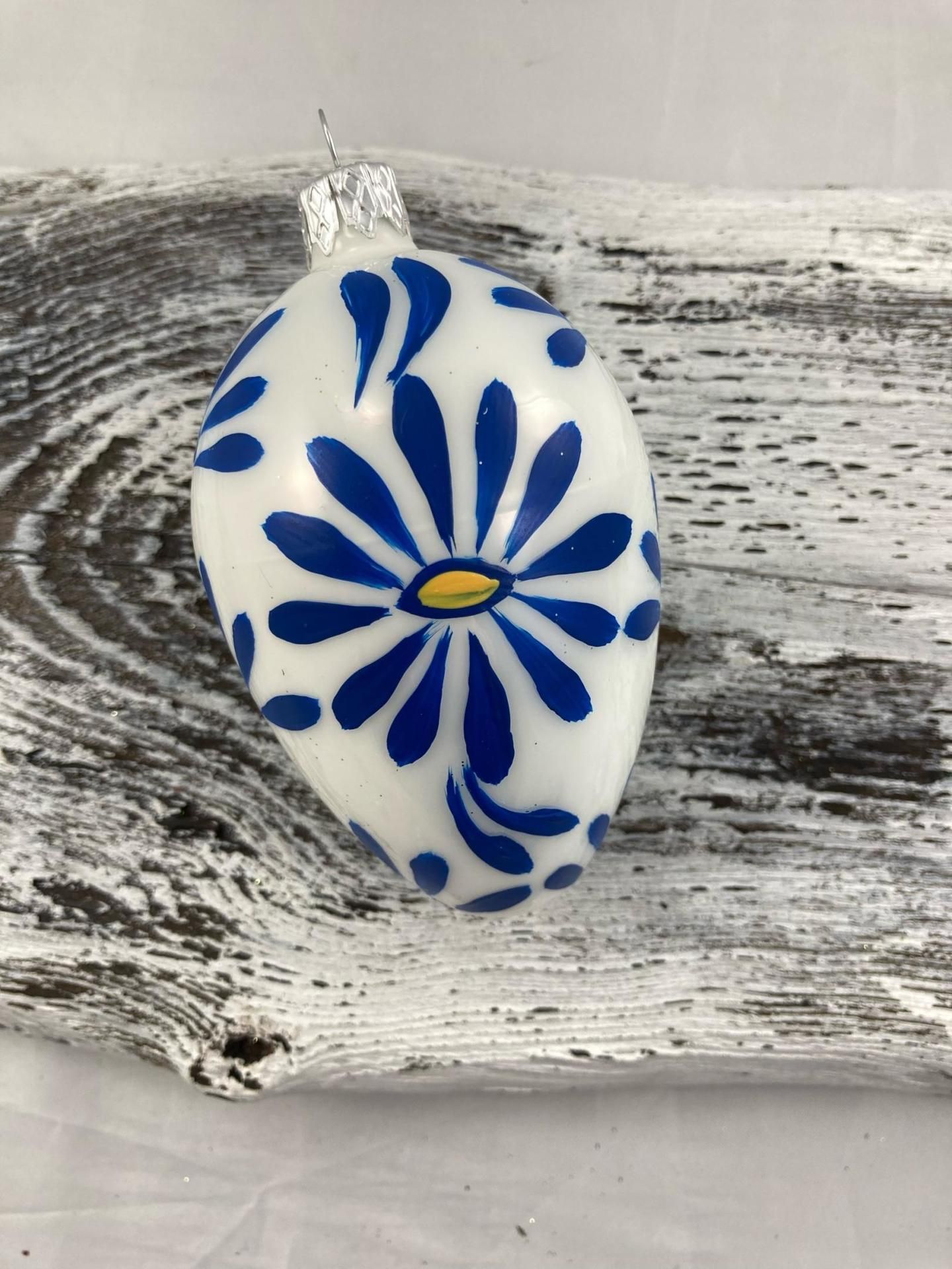 Sklenené veľké vajíčko 468/141/1ks – biele, modré kvety