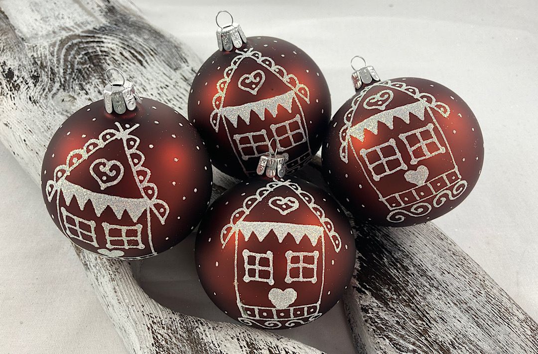 Sklenené guličky v hnedej matnej farbe s perníkovou chalúpkou.