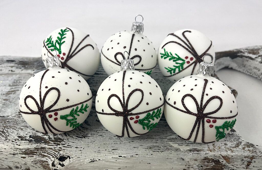 Sklenené guličky na bielom podklade s hnedou mašličkou a zelenou vetvičkou. Vzor je z oboch strán rovnaký.
