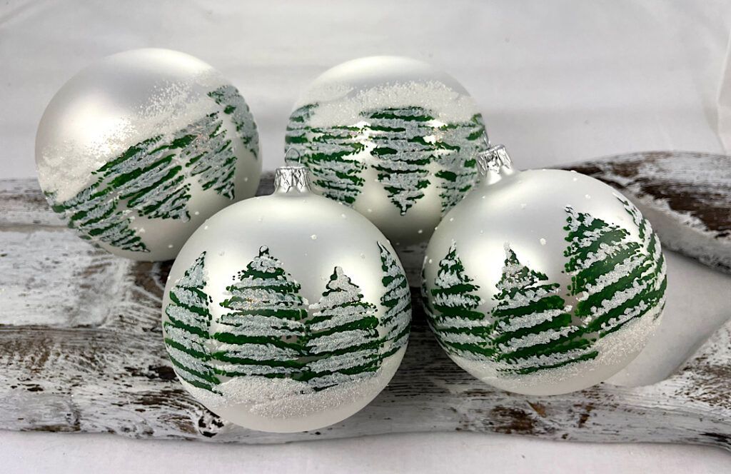 Sklenené veľké vianočné gule v maľbou hustých stromov. Maľba sa nachádza len z jednej strany a tvorí ju 5x strom .