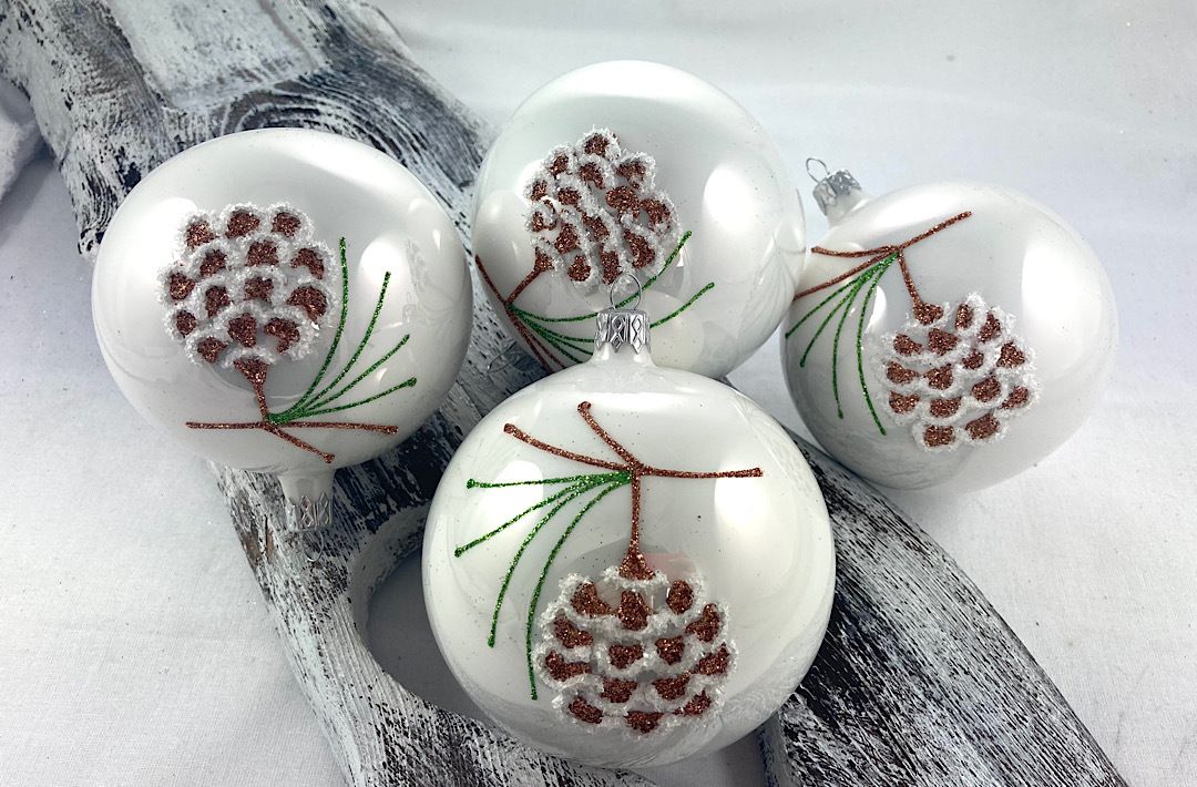 Sklenené guličky na bielom porceláne s motívom šišky.