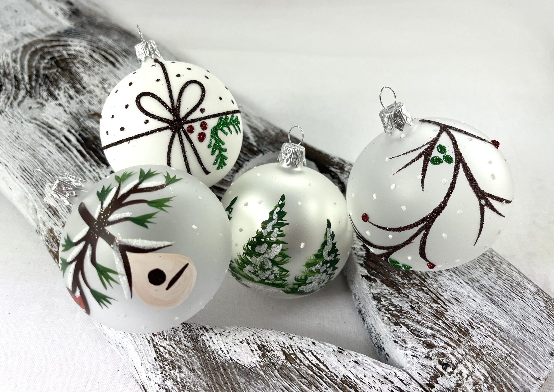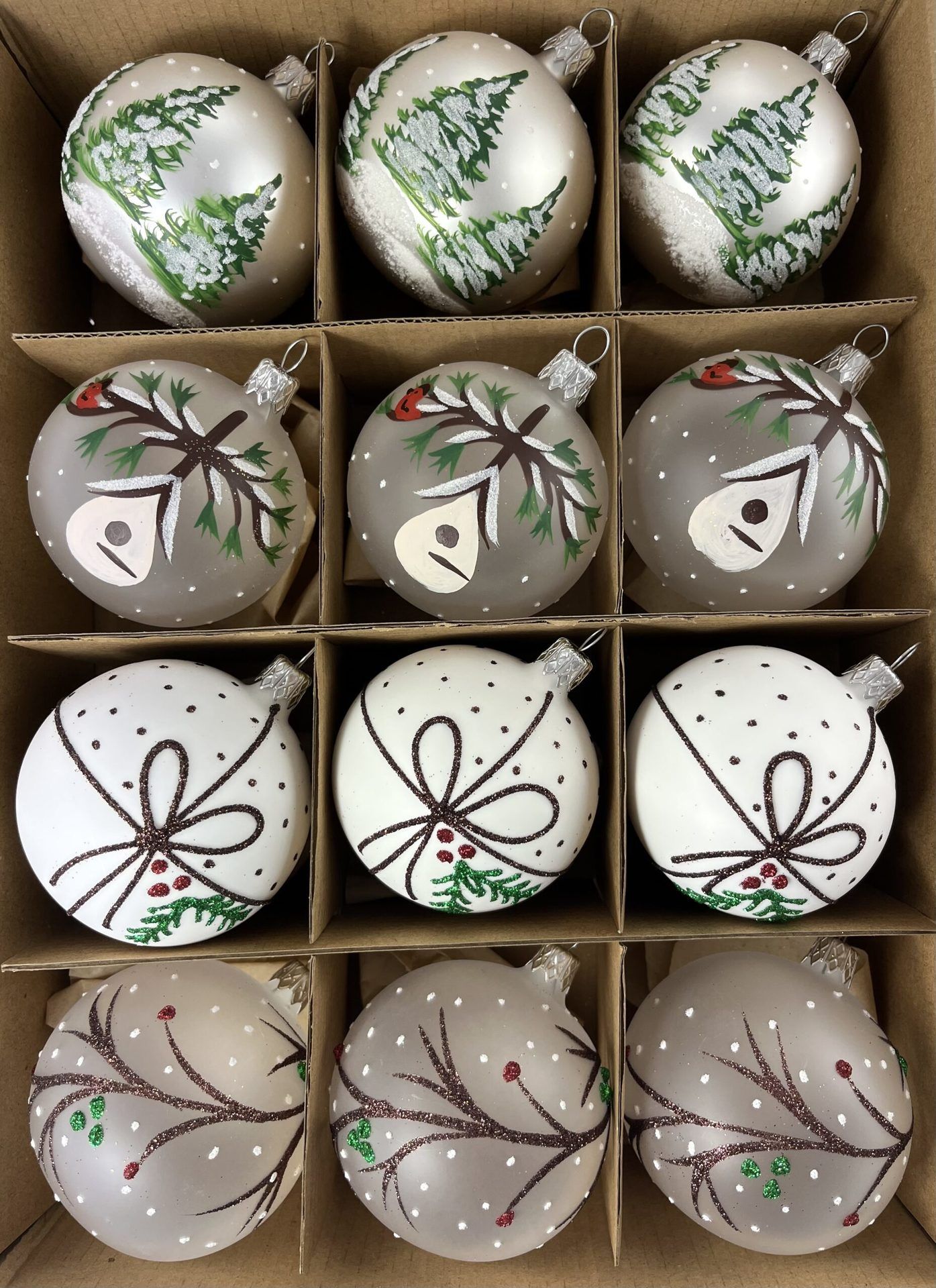 Sklenený vianočný set v prírodnej tematike. V balení nájdete štyri druhy po 3 kusy.
