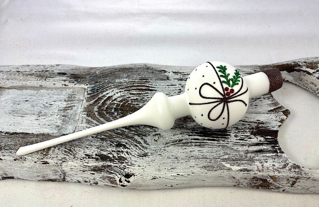 Sklenený špic na bielom podklade s hnedou mašličkou a zelenou vetvičkou.