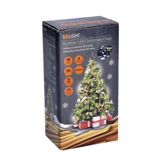 Solight LED vonkajšia vianočná reťaz, 50LED, 5m, 3m prívod, 8 funkcií, IP44, 3x AA, studená biela