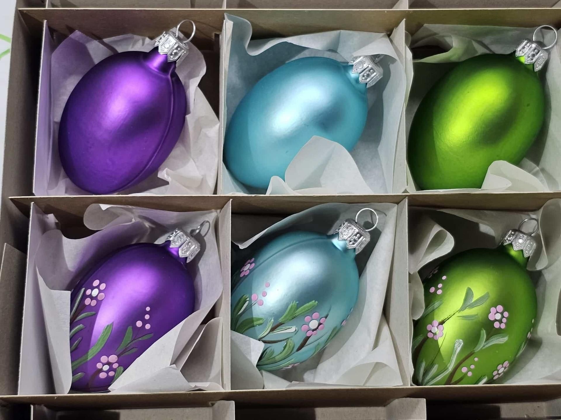 Súprava 6 kusov sklenených veľkonočných vajíčok o rozmere 4,5 x 7,5 cm, tri kusy s dekorom a 3 kusy bez dekoru.