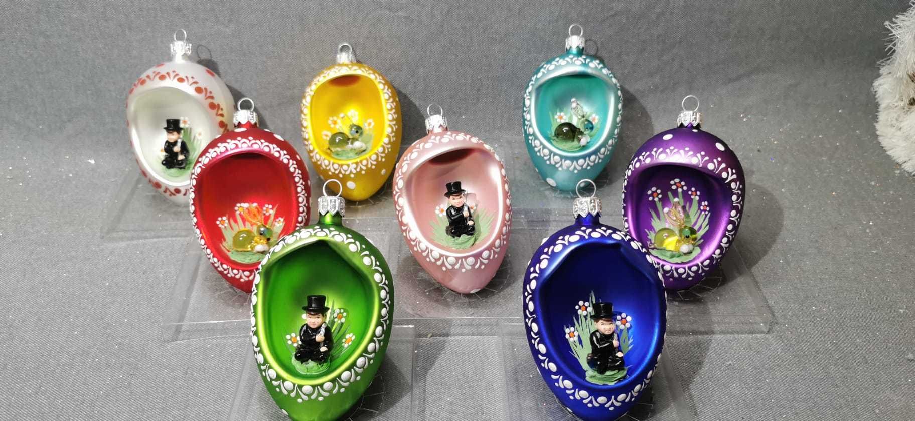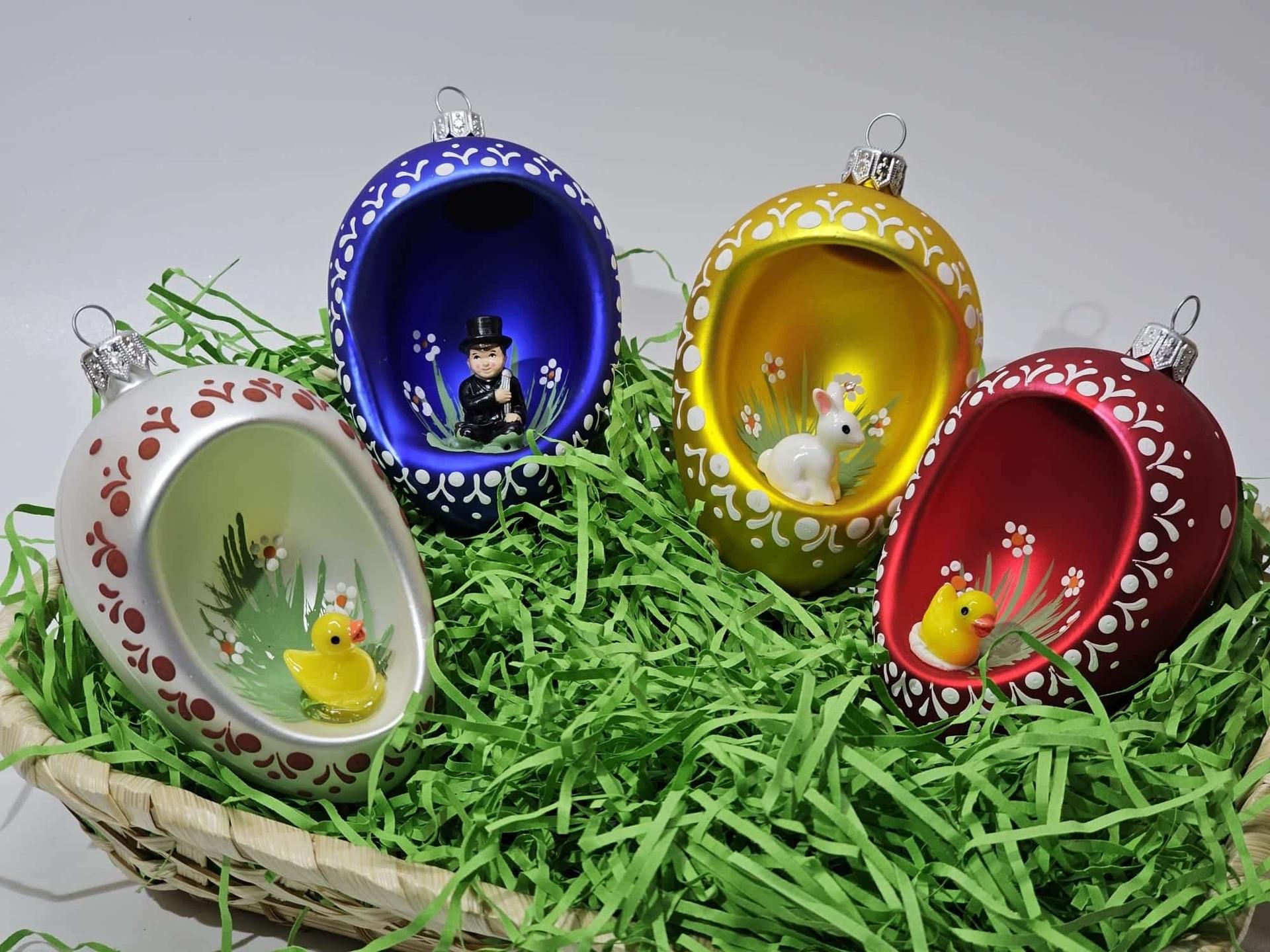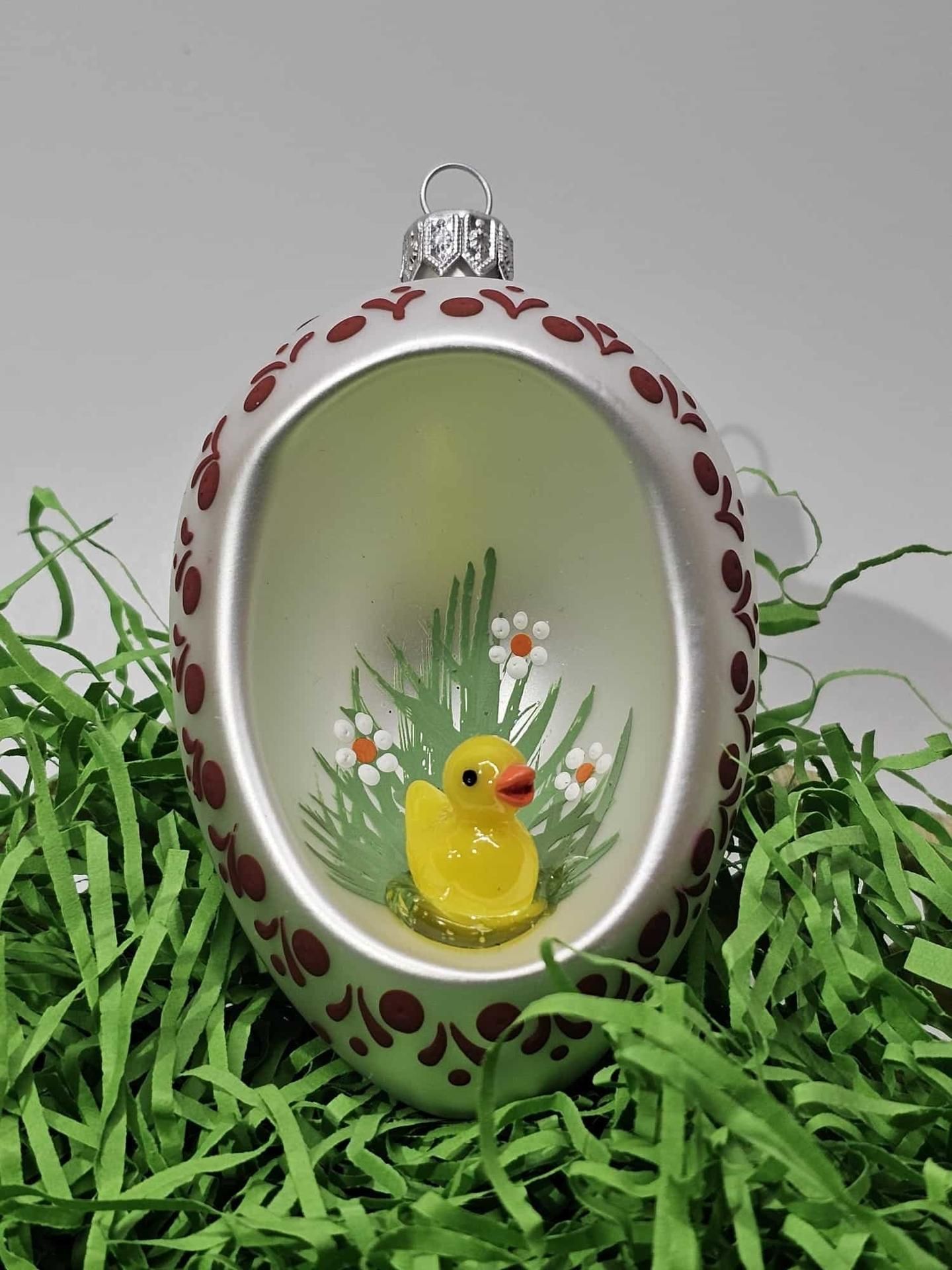Ručne fúkané a zdobené Veľkonočné vajíčko s profukom a dovnútra usadenou figúrkou. Figúrka mix skla a plastu.